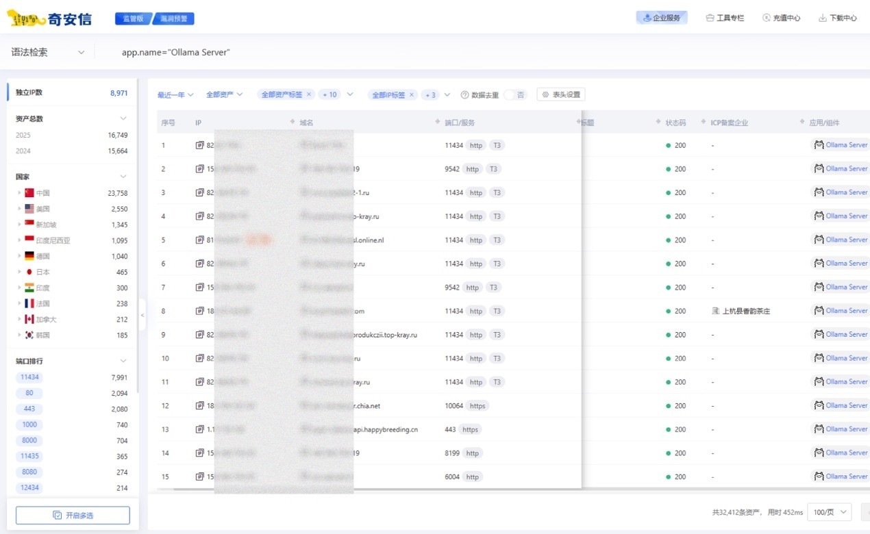奇安信资产测绘鹰图平台显示大概有8971个IP运行了Ollama